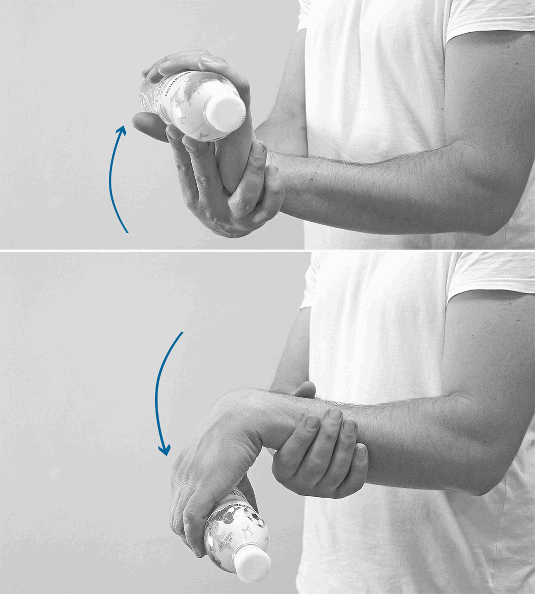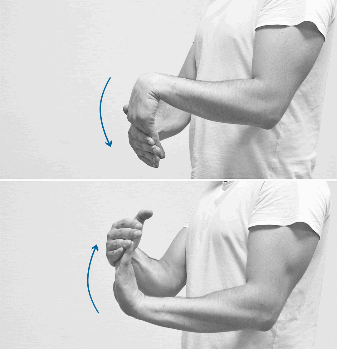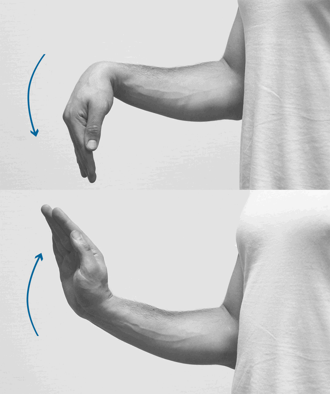 Аккуратно надавите здоровой рукой на пальцы поврежденной руки с тыльной стороны, чтобы усилить сгибание в запястье. Удерживайте 15-30 секунд. Затем разогните кисть, и осторожно нажмите на пальцы в обратном направлении, чтобы усилить разгибание. Удерживайте также 15-30 секунд. 3 повторения в каждую сторону.