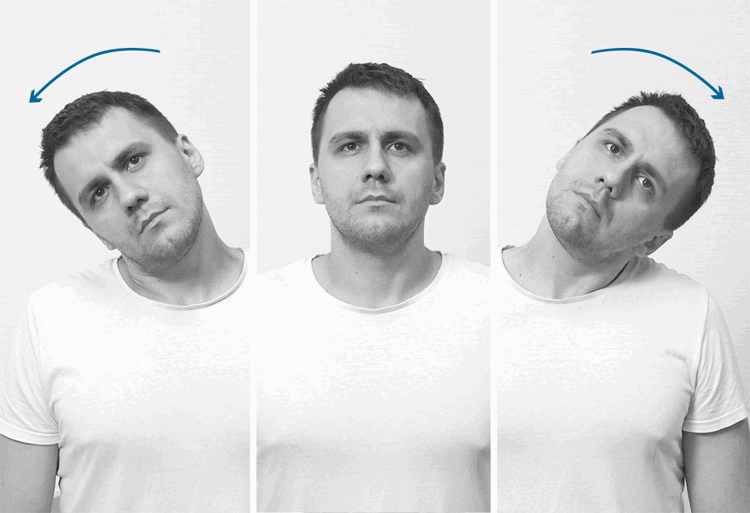 Сидя на стуле, держите спину и шею прямо. Медленно наклоните голову в сторону таким образом, чтобы ваше правое ухо максимально приблизилось к правому плечу, движение должно быть плавным – до ощущения боли в мышцах, а затем вернитесь в исходное положение. Расслабьтесь и повторите движение в другую сторону. Следите, чтобы во время выполнения упражнения вы не крутили головой и не поднимали плечо. Повторите это упражнение 10 раз в каждом направлении.
