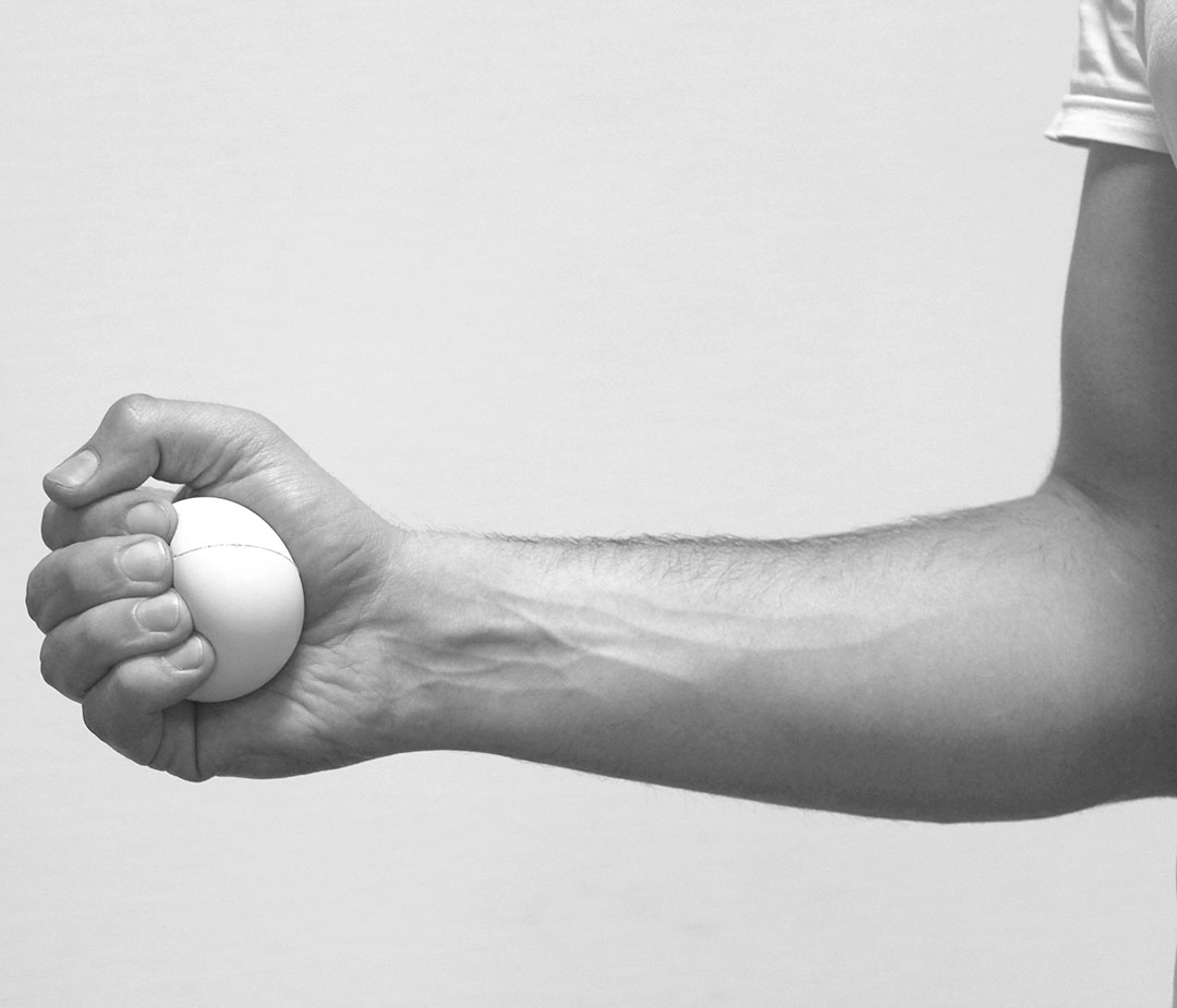 Сожмите мягкий резиновый шар и удерживайте сжатие 5 секунд. 2 подхода по 15 повторений.