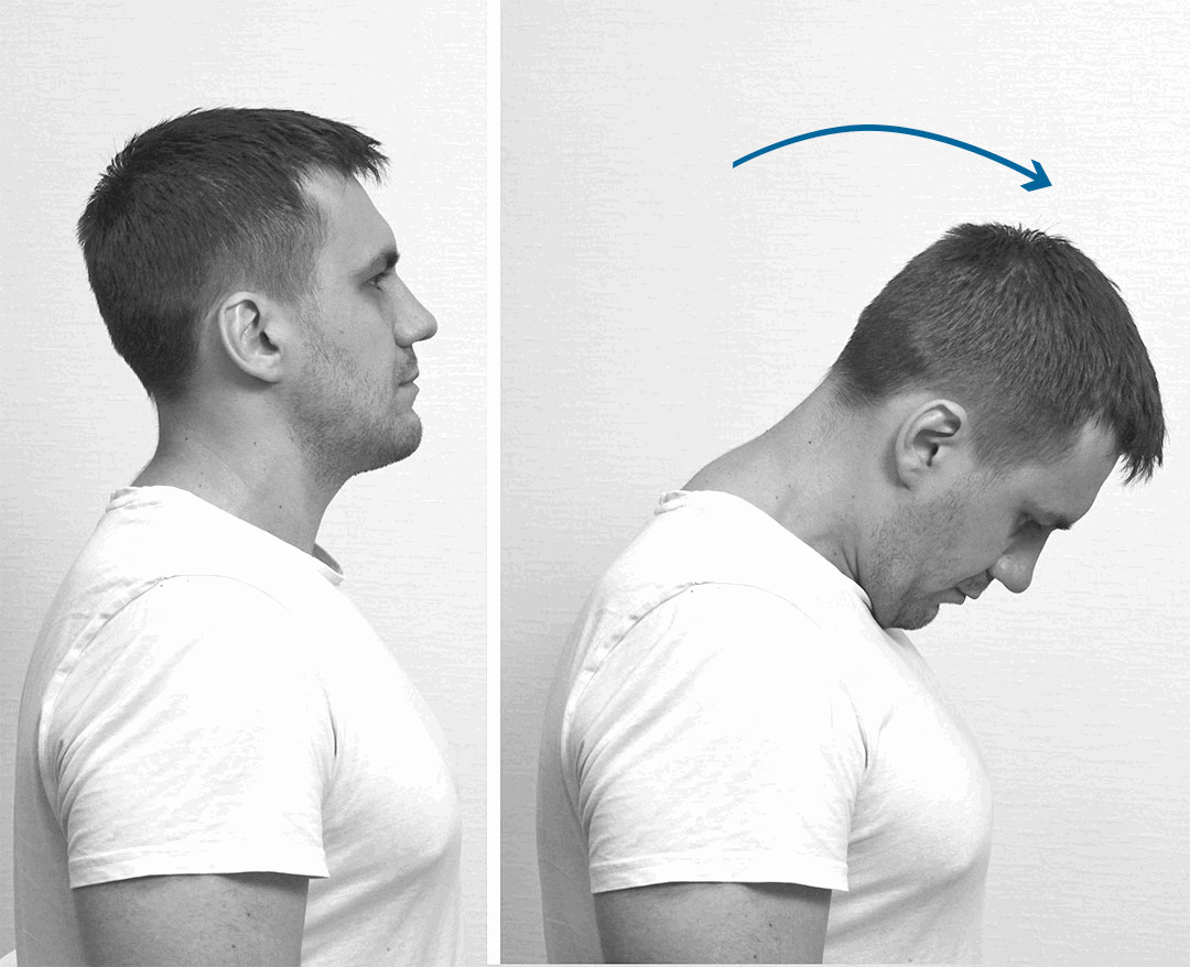 Сидя на стуле, держите спину и шею прямо. Плавно согните голову вперед, стараясь дотронуться подбородком к груди, и удерживайте достигнутое положение 5 секунд. Повторить 10 раз.