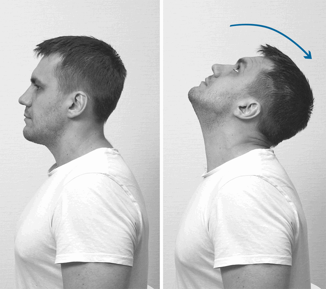 Сидя на стуле, держите спину и шею прямо. Медленно откиньте голову назад, чтобы подбородок смотрел максимально вверх. Затем вернитесь в исходное положение. Важно во время упражнения сидеть с прямой спиной. Повторить 10 раз.
