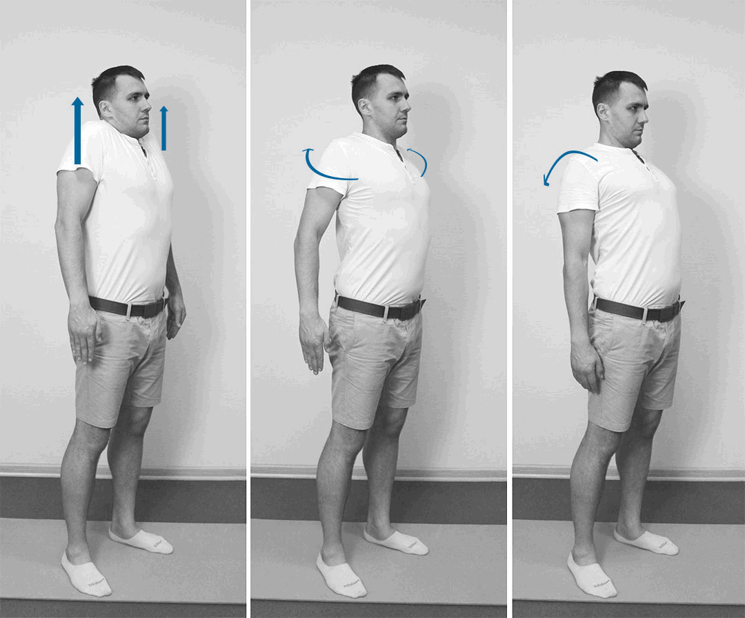 Поднимите плечи вверх и удерживайте 5 секунд. Сожмите лопатки вместе и подержите 5 секунд. Затем потяните лопатки вниз, как бы пытаясь уложить руки в задние карманы брюк, и тоже удерживайте 5 секунд. Повторить 10 раз каждое действие.
