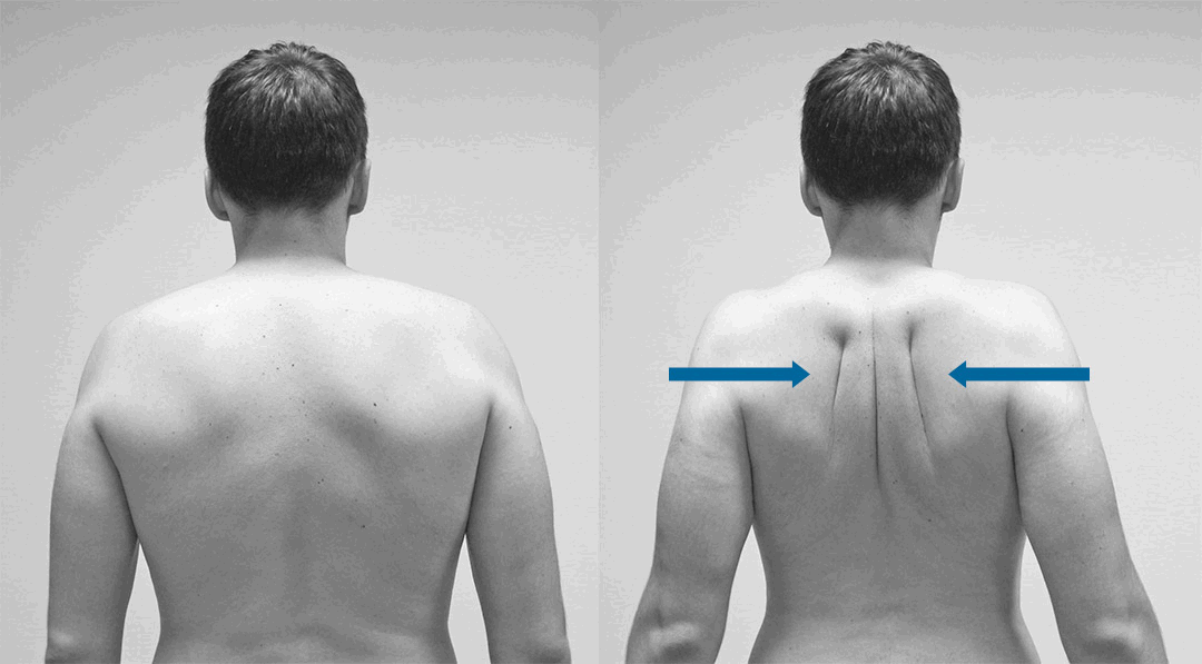 Сидя или стоя, руки по бокам. Сожмите лопатки максимально друг к другу и удерживайте 5 секунд. 2 подхода по 15 повторений