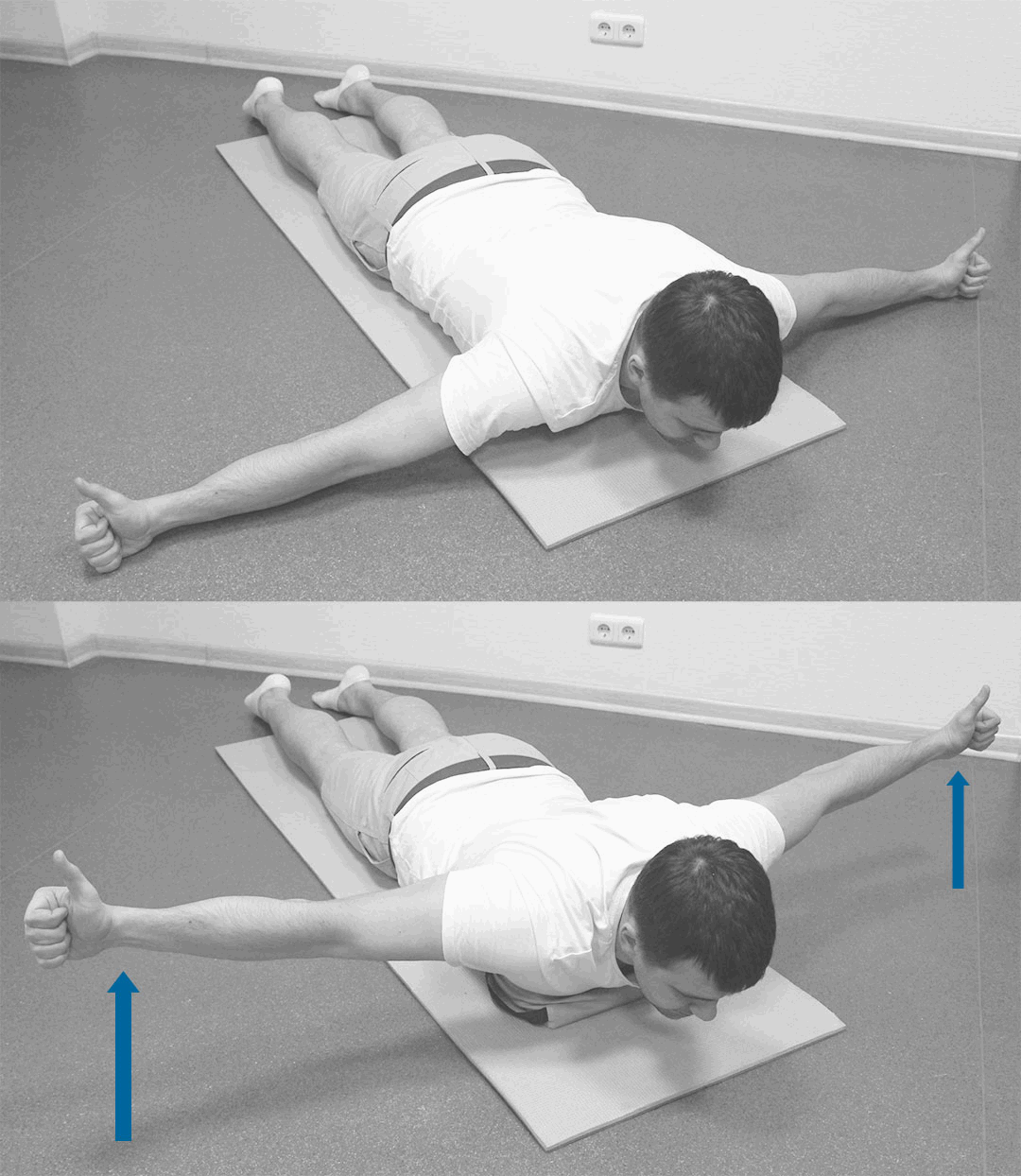Лягте на живот, положив маленькую подушку под грудь. Разведите руки в стороны, локти прямо, а большой палец по направлению к потолку. Медленно поднимите руки к потолку, напрягите плечи и плавно их опустите. 2 подхода по 15 повторений. Для увеличения эффективности упражнения, можно брать в руки небольшие веса.