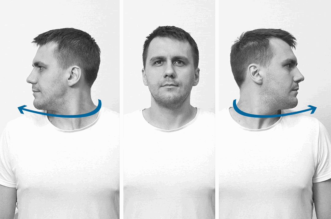 Сидя на стуле, держите спину и шею прямо. Сначала медленно поверните голову вправо, движение должно быть плавным — до ощущения боли в мышцах, а затем вернитесь в исходное положение. Расслабьтесь и повторите движение в другую сторону. Повторить 10 раз в каждую сторону.